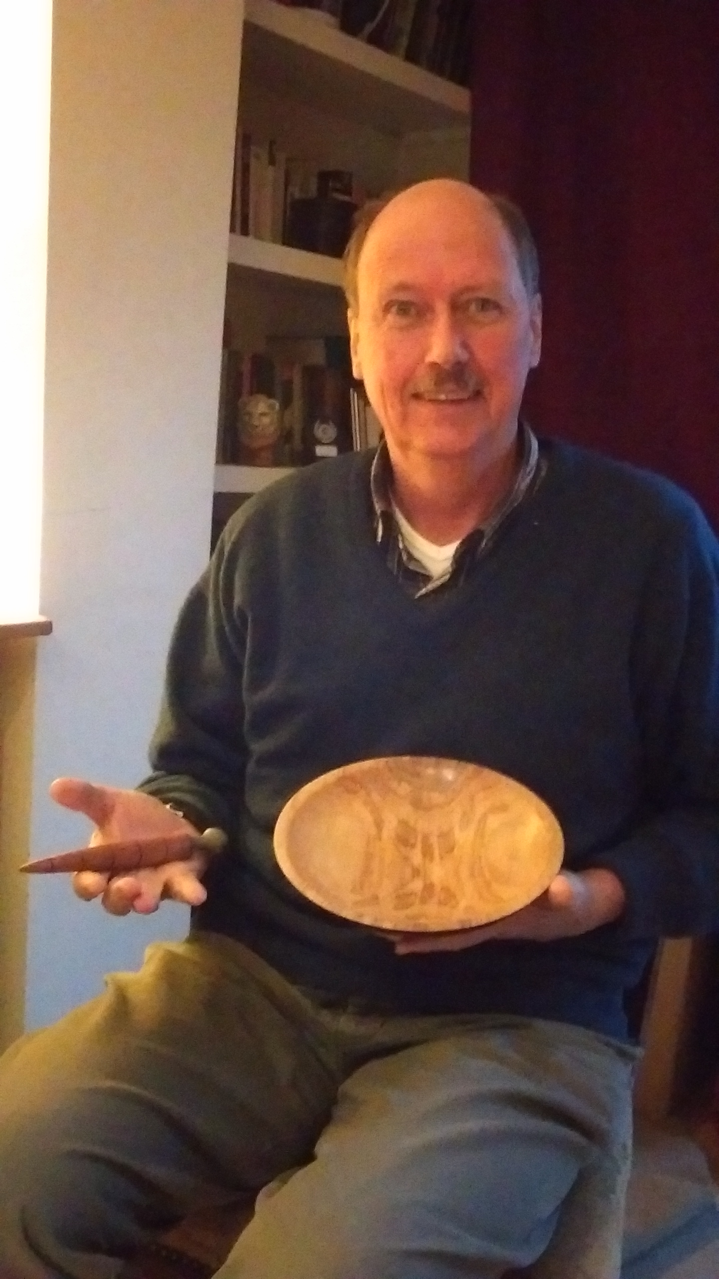 We used some dyes to give the dibber a carrot appearance. The bowl is from beech,, about 10″ diameter and 2.5″ high, with a wax finish on the inside, and some red stain and acrylic lacquer finish on the outside.
