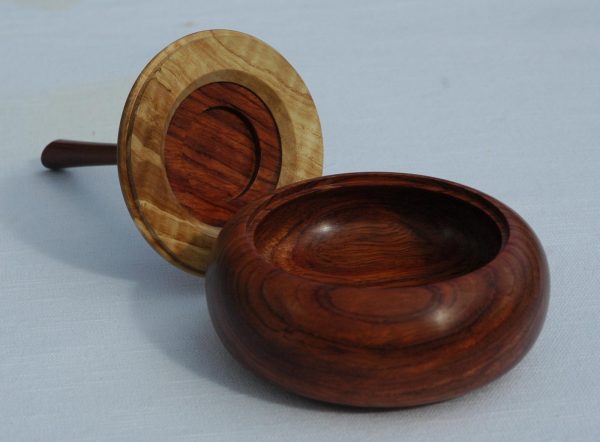 The lid on this box is made from a piece that was cut out of the main body and then inserted into an outer rim of curly olive ash, which provides some optical contrast (and also the necessary material to make up for the cut).