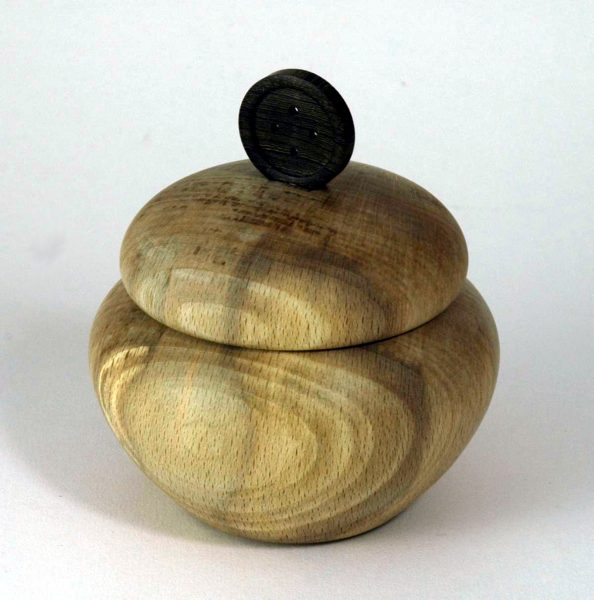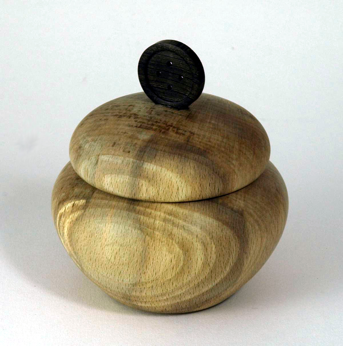 A small box made from beech, with a decorative button on the lid. This could suggest that the box is meant to hold buttons, but this really is only a suggestion.