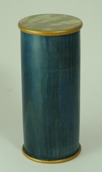 This box is made from sycamore, with some guilt varnish on the rounded corners and blue stain on the main body. The wood is spalted, which did give me quite some grief when trying to get a nice finish on the top and bottom, only once it was saturated with sanding sealer would it sand nicely.